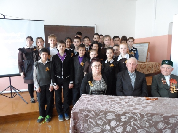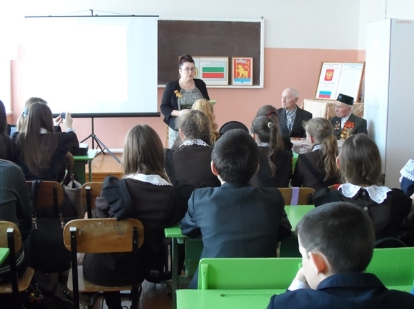 8.04. во Всероссийском уроке Победы дан старт традицонному месячнику Победы. В текущем году он посвящен 70-летнему юбилею Великой Победы. В нашей школе также прошел Урок победы, который провела учитель истории Абдуллина Л.Р. На уроке приняли участие учащиеся 6-10 классов. В гости были приглашены ветераны войны, труженики тыла и представители категории “Дети войны”. Ветеран Великой Отечественной войны Гайсин М. Поделился своими воспоминаниями бывшего радиста, радостью получения медали от президента Белоруссии. Учитель-ветеран Абдуллин Б.М. вспоминал будни детей в послевоенные годы, призвал детей ценить мирную жизнь. Красной нитью через все мероприятие протянулась мысль об ужасах войны, пожелания только мира на земле. После урока ветераны познакомились с обновленными экспозииями школьного музея.