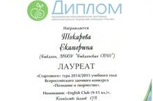 Награждение 22.12.2014 20 декабря на школьной линейке была награждена ученица 10 класса Токарева Е.Н. дипломом лауреата Всероссийского конкурса «Познание и творчество» по английскому языку. Желаем ей дальнейших успехов и новых побед.