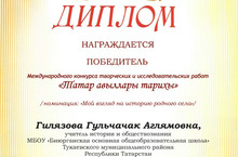 Учитель нашей школы по истории и обществознания Гилязова Г.А. участвовала на Международном конкурсе творческих и исследовательских работ «Татар авыллары тарихы» и награждена дипломом победителя. Поздравляем!