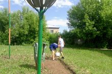 Пока девочки пропалыают грядки, мальчики обновляют школьную географическую площадку.