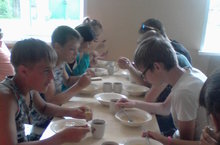 Ребята хорошо поработали на участке. С большим удовольствием съедают все, что им дают в школьной столовой.