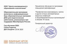 Наши воспитатели прошли обучение по программе "Профилактика коронавируса, гриппа и других острых респираторных вирусных инфекций в общеобразовательных организациях"