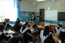 Борды мәктәбенең рус теле укытучысы Елена Петровна 9 класс укучыларыннан рус теле предметы буенча сынап карау имтиханы ала.