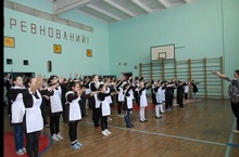 Ученики и учителя с большим желанием выполняют упражнения под музыкой. Зарядку проводит завуч по воспитательной работе Солдатова Татьяна Павловна.