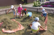 Кирәкле эш коралларын алып, балалар һәм тәрбияче бергәләп үзләренең уен мәйданчыгын тәртипкә китерделәр. Балалар группа территориясендәге чаптырылган үләнне бик теләп җыештырдылар. Бер-берсенә булышып, ничек дөрес җыештырырга кирәклеген әйтеп тордылар.