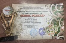 Лауреат III степени Открытого Республиканского детского фольклорного конкурса "Живи, родник" 16.04.2022