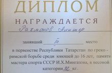 5-7 октября 2017 г. в городе Заинск прошло Первенство Республики Татарстан по греко-римской борьбе среди юношей до 16 лет, посвященной памяти мастера спорта СССР И.Х. Мингазова. Воспитанник тренера-преподавателя МБУ ДО "ДЮСШ Тукаевского муниципального района", Гизатулина Р. И., Рахмонов Алишер (п. Круглое Поле) занял III место. ПОЗДРАВЛЯЕМ!
