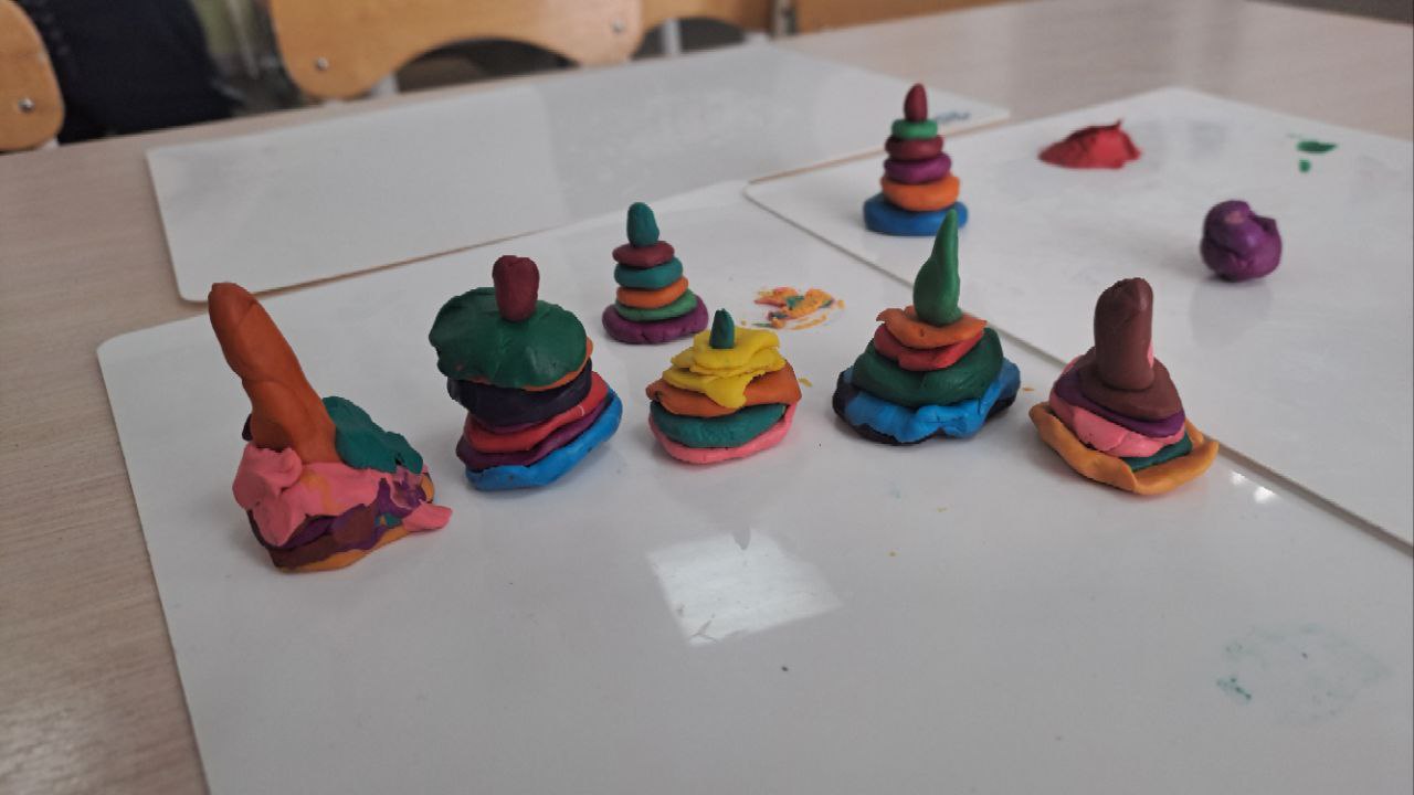 Вот и наши ребята из средней группы № 1 "Малыши" совместно с педагогом Ахаевой О.Ю. решили поделиться своей любовью к пирамидкам, слепив пирамидку из пластилина. В результате получились яркие и красочные пирамидки.
