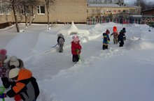 На прогулках дети совместно с воспитателями и младшими воспитателями приобщаются к труду на свежем воздухе, участвуют в уборке снега на территории.