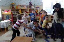 В старшей группе прошел веселый новогодний праздник. С помощью волшебного колокольчика дети побывали в разных сказках. В поисках Деда Мороза дети повстречали героев сказок: Белоснежку с Гномами, Султана с его красавицами, Красную шапочку с Волком и Бабу Ягу с ее котом. Путешествие закончилось тем, что Дед Мороз был расколдован, подарки были найдены и вручены детям.