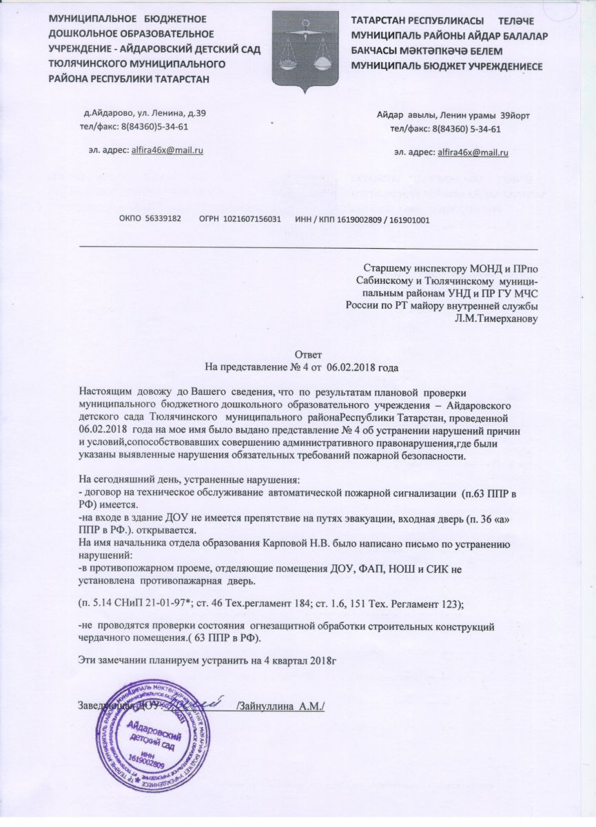 МБДОУ - Айдаровский детский сад Тюлячинского муниципального района РТ (временное приостановление деятельности, 2021г.)