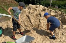 Вооружившись маленькими тачками, наши юные помощники с важным видом таскали песок, стараясь не отставать от взрослых. Было видно, как горят их глаза — ведь они чувствовали себя настоящими строителями и помощниками!