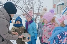 Дети старшей группы принесли кормушки, изготовленные вместе с родителями, и развесили на участке детского сада. Будут подкармливать пернатых до появления первых проталин