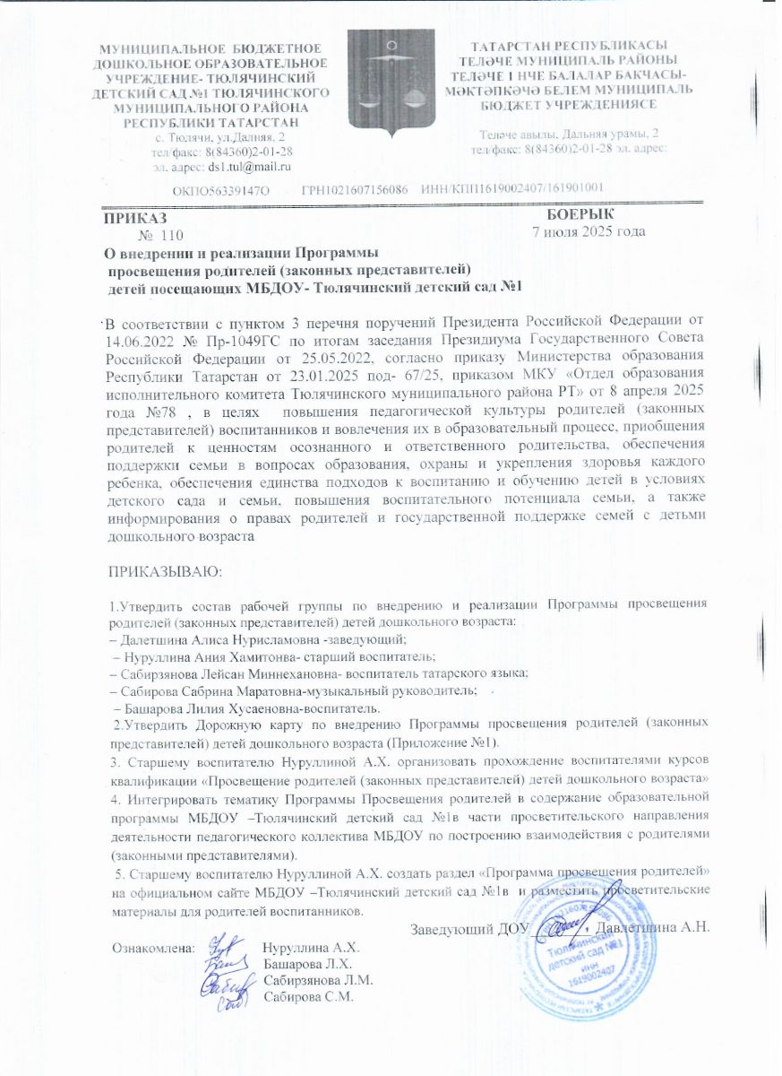 Приказ по ДОУ о внедрении Программы просвещения родителей( законных представителей) детей дошкольного возраста, посещающих ДОУ