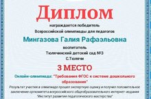Рәсәй күләмендә уздырыла торган онлайн-олимпиадасында катнашып безнең 3нче балалар бакчасы тәрбиячесе Минһаҗева Г.Р. 3 урын дипломына лаек булды.