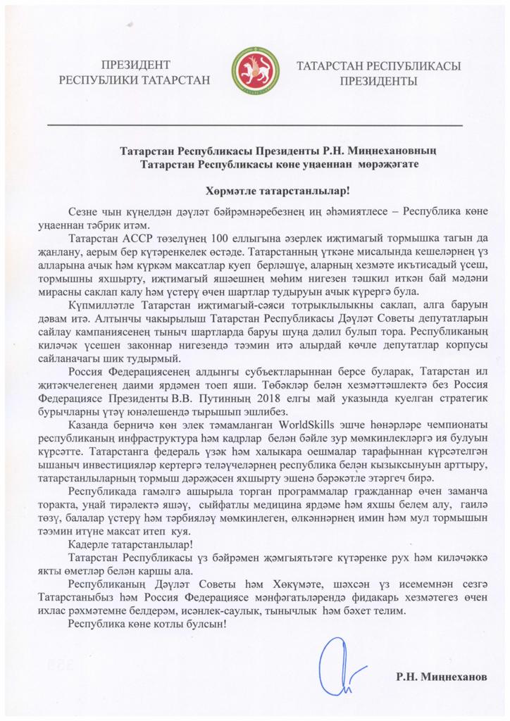 Обращение Президента Республики Татарстан Р.Н.Минниханова по случаю Дня Республики Татарстан