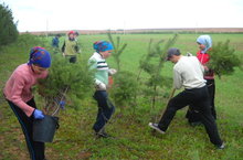 Сегодня с целью озеленения территории школы была организована акция по посадке деревьев. Учащиеся вместе с учителями посадили около 100 деревьев, кустарников. Были посажены такие деревья и кустарники : ели, рябины , смородины, липа и другие.