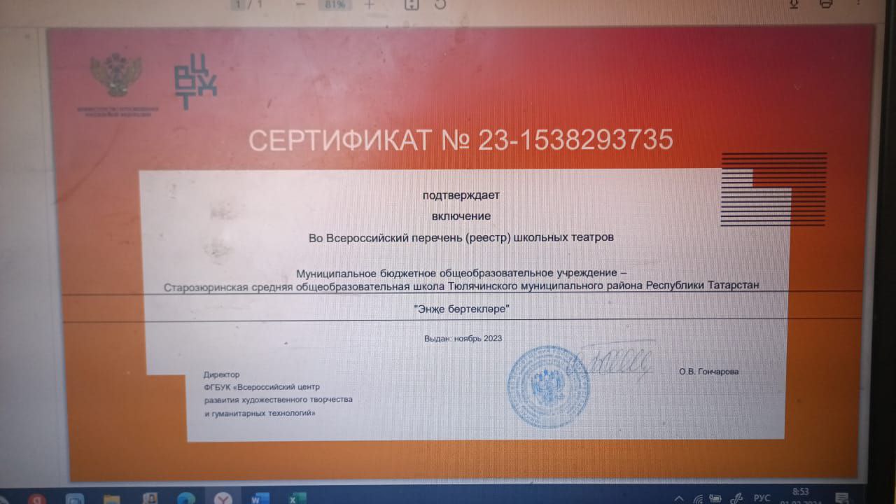 Сертификат Филиала МБОУ- Старозюринская СОШ - «Караширминская НОШ»