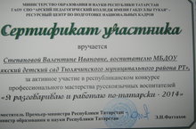 Степанова В.И. стала Лауреатом республиканского конкурса профессионального мастерства русскоязычных воспитателей "Я разговариваю и работаю по -татарски- 2014" / Степанова В.И. “Мин татарча сөйләшәм һәм эшлим - 2014” дип исемләнгән Республика конкурсында катнашып Лауреат исеменә лаек булды 18.12.2014
