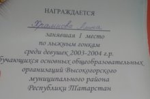 Чаңгы ярышы буенча 8 нче сыйныф укучысы Храмцова Алина 2003-2004 нче елгы кызлар арасында 1 нче урын алды.