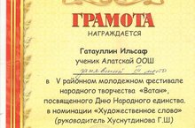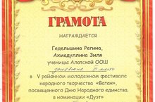 29 нчы октябрьдә район мәдәният йортында Халыклар бердәмлеге көненә багышланган 5 нче район яшьләр халык иҗатының "Ватан" фестивале булып узды. Безнең мәктәптән җырчы кызларыбыз Гаделшина Регина, Әхмәдуллина Зилә "Дуэт" номинациясендә "Эх,татар Алатым" җырын җырлап өченче урынны алдылар. Аларга киләчәктә дә иҗади уңышлар теләп калабыз.Алатская средняя школа. -