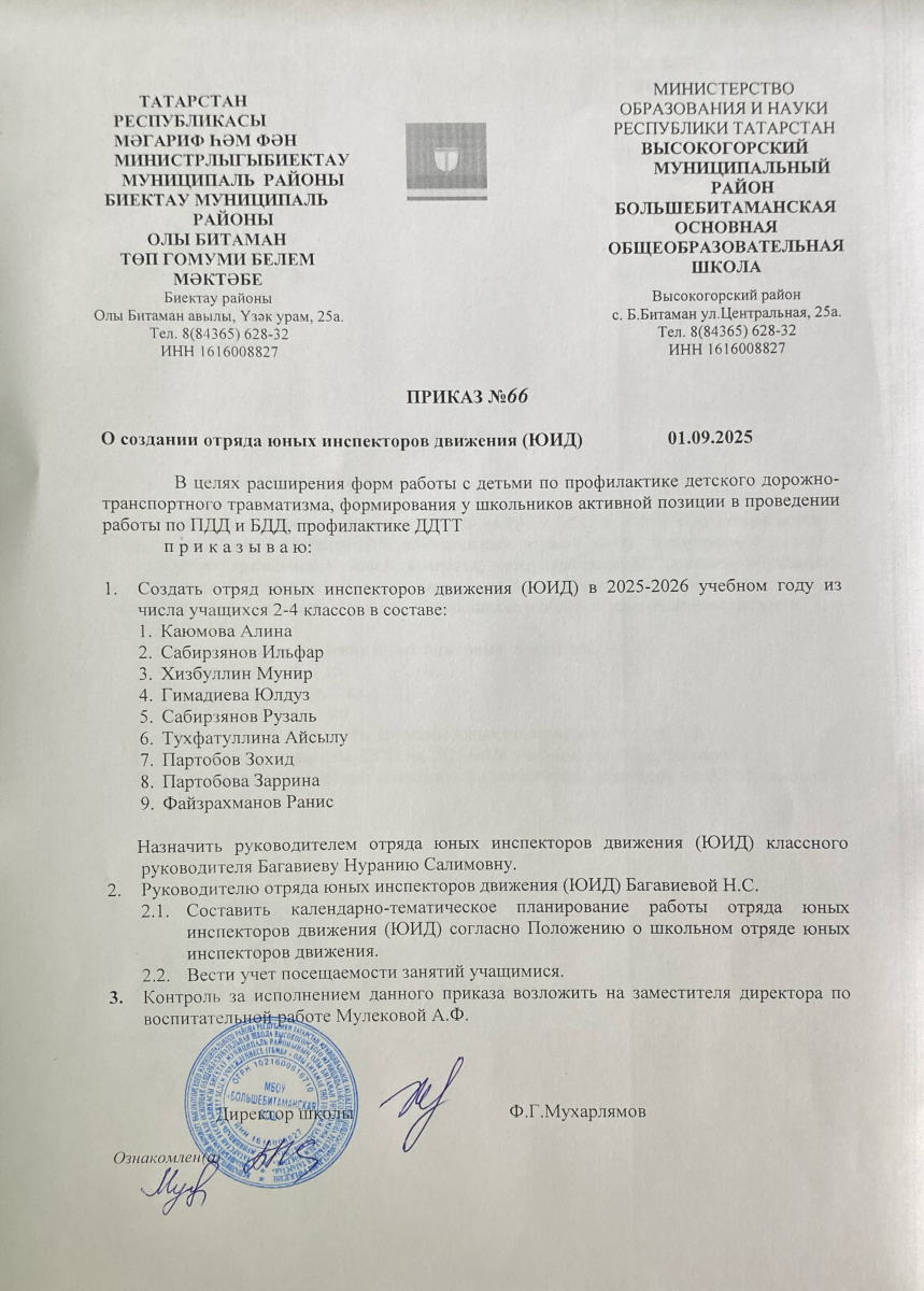 Приказ о создании отряда ЮИД на 2025-2026 учебный год