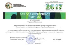 Министр лесного хозяйства Республики Татарстан А.А.Назиров наградил благодарственным письмом Яруллину Фирдавус Нажиповну -
