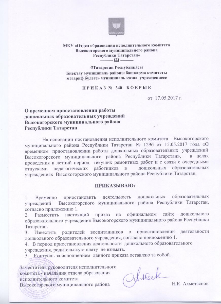Приказ на временное приостановление на летние месяца 18.05.2017