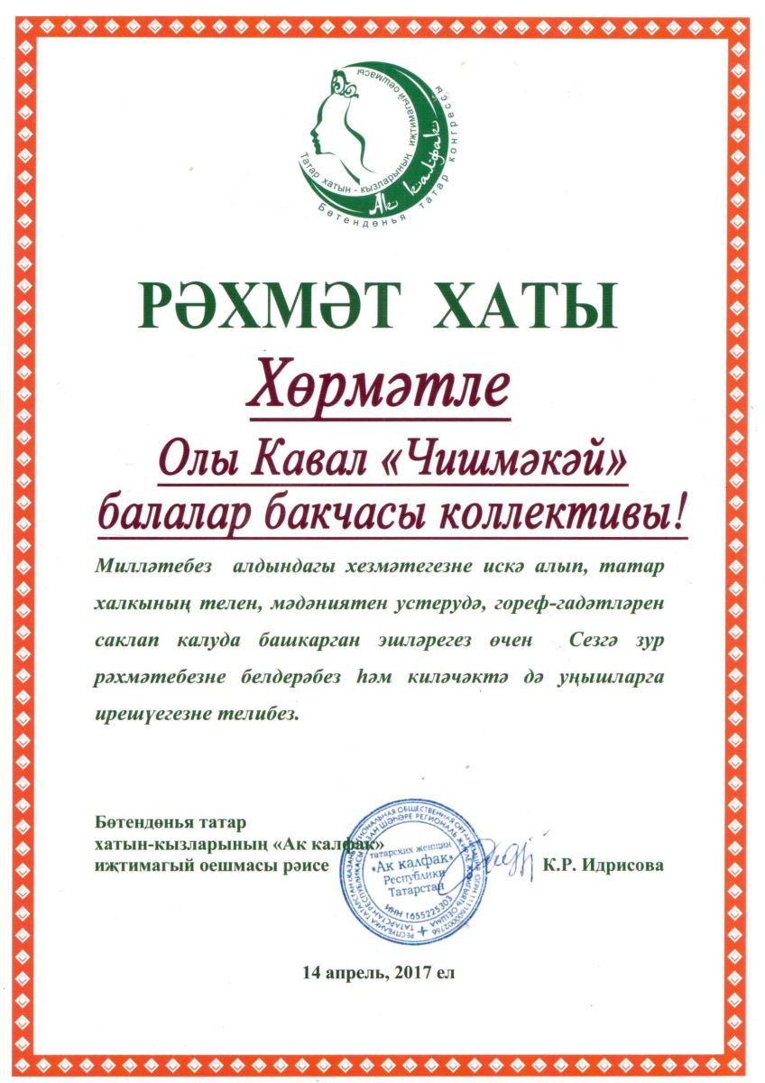 Бөтендөнья татар хатын-кызларының " АК КАЛФАК" иҗтимагый оешмасы рәисе К.Р.Идрисовадан РӘХМӘТ ХАТЫНА лаек булдык.