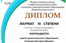 Поздравляем педагога по журналистике Галявиеву Викторию Юрьевну с дипломом лауреата III степени во Всероссийском конкурсе учебно-методических работ педагогов дополнительного образования "Персональный успех" .