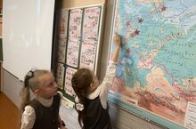 "Җиңүгә 80 адым" акциясе кысаларында беренче сыйныф укучылары Геройлар шәһәрләре белән таныштылар, Россия картасына кызыл йолдызлар беркеттеләр.