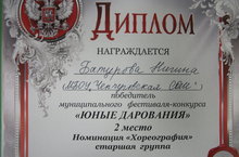 Поздравляем ученицу 10 класса Батурову Нигину победителя муниципального фестиваля-конкурса "Юные дарования" в номинации "Хореография"