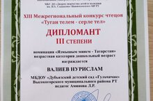Поздравляем воспитанников старшей группы Валиева Нурислама с Дипломом 3 степени, Бильданову Аделю с Грамотой "За творческий подход" в XIII Межрегиональном конкурсе чтецов "Туган телем - серле тел".