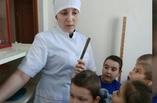 Балаларны шәфкать туташы булмәсе белән таныштырды һәм табибның авыруны тикшергәндә нәрсәләр кулланулары турында сөйләде. Балалар шпатель белән нәрсә карыйлар ? ; Фонендоскоп - ул нинди корал ? ;Термометр нәрсәгә кирәк ?табибларга ярдәм итүчеләрне ничек атыйлар ? , нәрсә соң ул шифаханә ? кебек сорауларга җавап таптылар . Саулыкның зур байлык икәнен төшенде балалар.