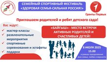 Мы рады пригласить вас на большой и яркий семейный спортивный фестиваль, который пройдёт 8 июля 2025 года в детском саду «Байгыш». Это мероприятие организовано в рамках проекта по гранту первых и посвящено Дню семьи, любви и верности.