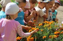 Во время прогулки ребята любовались цветами на территории детского сада, поливали их.