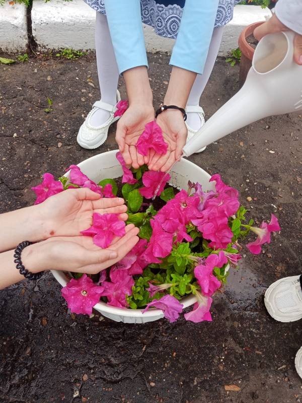 В акции «Капля жизни» дети бережно поливали цветы, сложив ладошки, как будто каждая капля воды — это капля жизни, капля сострадания, капля памяти о тех, кого мы потеряли. Этот простой, но глубокий по смыслу ритуал помог юным школьникам понять важность ценности человеческой жизни, силы единства и необходимости противостоять насилию.
