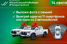 14 сентября, в день проведения выборов Раиса Татарстана и муниципальных депутатов пройдет фотоконкурс #ТатарстанАлга #ВсейСемьейНаВыборы. По его итогам можно выиграть автомобиль или смартфон