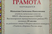 Учитель Здоровья — 2019г 15.10.2019Поздравляем Манькову Светлану Николаевну, учиетеля начальных классов, с 3-им местом в Муниципальномэтапе республиканского конкурса «Учитель Здоровья». Желаем вам здоровья и новых творческих вдохновений.