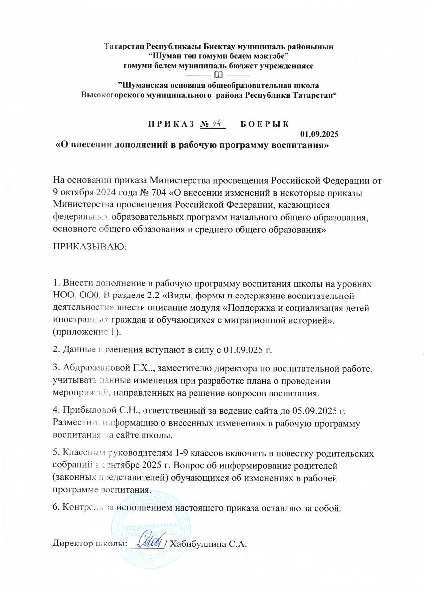 Приказ о внесении дополнений в рабочую программу воспитания на 2025 - 2026 учебный год