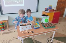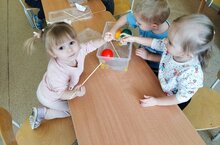 Сегодня малыши первой младшей группы играли с водой , знакомились в игровой форме со свойствами предметов тонет- не тонет .