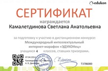 Ученики 4-х классов участвовали в дистанционном Международном интеллектуальном интернет-марафоне «ЭДУКОНец». 4 ученика получили золотые сертификаты (I место), 5 учеников – серебряные (II место). Учителя Камалетдинова С.А., Иванова О.В. получили золотые сертификаты - за подготовку победителей.
