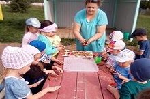 Сегодня воспитатель Александра Гильванова провела занятие по лепке во время прогулки. Ребята лепили овощи из глины.