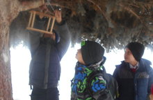 Сегодня мальчишки повесили кормушки во дворе школы.
