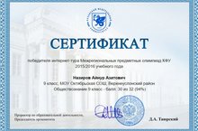 Назиров Айнур ученик 9 класса МБОУ «Октябрьская СОШ» стал победителем интернет-тура Межрегиональных предметных олимпиад КФУ по предмету обществознание