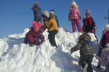 Дети старшей группы д/с «Солнышко» гуляя на участке и получив задание от воспитателя, Якимовой Ирины, с большим энтузиазмом и желанием преодолевали снежные горы. Погода на радость детям солнечная, ясная, "МАСЛЕНИЧНАЯ". Столько радости, душевного тепла на лицах детей: «Кто быстрее!». Расти здоровыми, сильными, ловкими – вот задача детского сада.