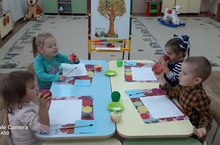 Сегодня в младшей группе малыши занимались аппликацией. Они учились составлять цельный аппликативный образ из 2-3 готовых силуэтов (яблоко и 1- 2 листочка), создавать композицию из разнородных элементов на фоне, передвигать детали в поисках наилучшего размещения и поочерёдно наклеивать.
