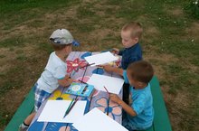 Урок рисования на свежем воздухе прошел в МБДОУ «Майданский детский сад». Не смотря на юный возраст воспитанников, темы для рисунков дети выбирали как взрослые: автомобили будущего, сельхозтехника, космические ракеты. Также детям очень понравилось рисовать вместе один общий рисунок. Дети решили нарисовать дом бабушки. Как оказалось, у всех бабушек дома почти одинаковые и детям было легко творить. На следующее занятие решили нарисовать своих любимых домашних питомцев и добрую соседскую корову Маруську. Дети с нетерпением ждут следующей художественной экскурсии.