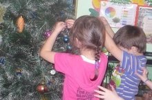Сегодня, рассказав детям небольшую предысторию о ёлках, воспитатель Светлана Ширяева показала, какими игрушками они станут наряжать новогоднюю гостью в своей игровой комнате. Ребята с огромным интересом рассматривали украшения, среди которых Дед Мороз и Снегурочка, космонавты, фрукты и овощи, разные шарики, животные и птицы, и, конечно же, звезда. Всё внимательно разглядев, воспитанники самостоятельно развесили игрушки.