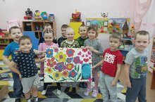 Воспитанники средней группы изготовили большую поздравительную открытку для мам и бабушек. Ребята самостоятельно вырезали, склеивали детали цветов и наклеивали готовые цветы на общую поздравительную открытку.
